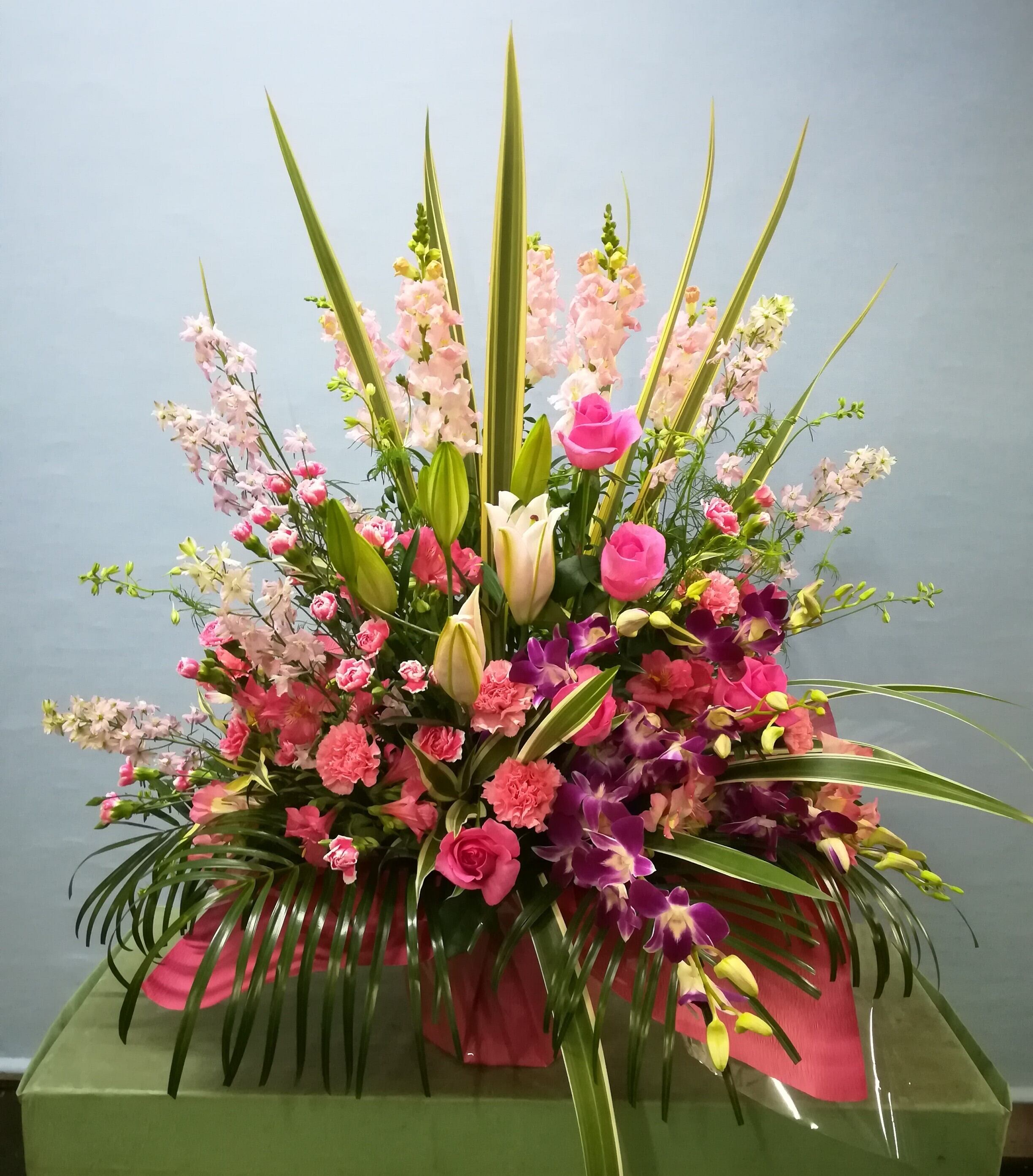 春色アレンジメントは、柔らかなピンク系の花々を使用し、穏やかで優しい雰囲気を醸し出します。心和むインテリアや大切な方へのギフトに最適な一品です!