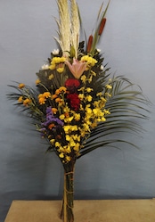 本堂用花束は、仏事にふさわしい美しい花々が織りなす、荘厳な雰囲気を演出する作品です。心を込めてお届けする、故人への敬意や感謝の気持ちを表現できる一品です!