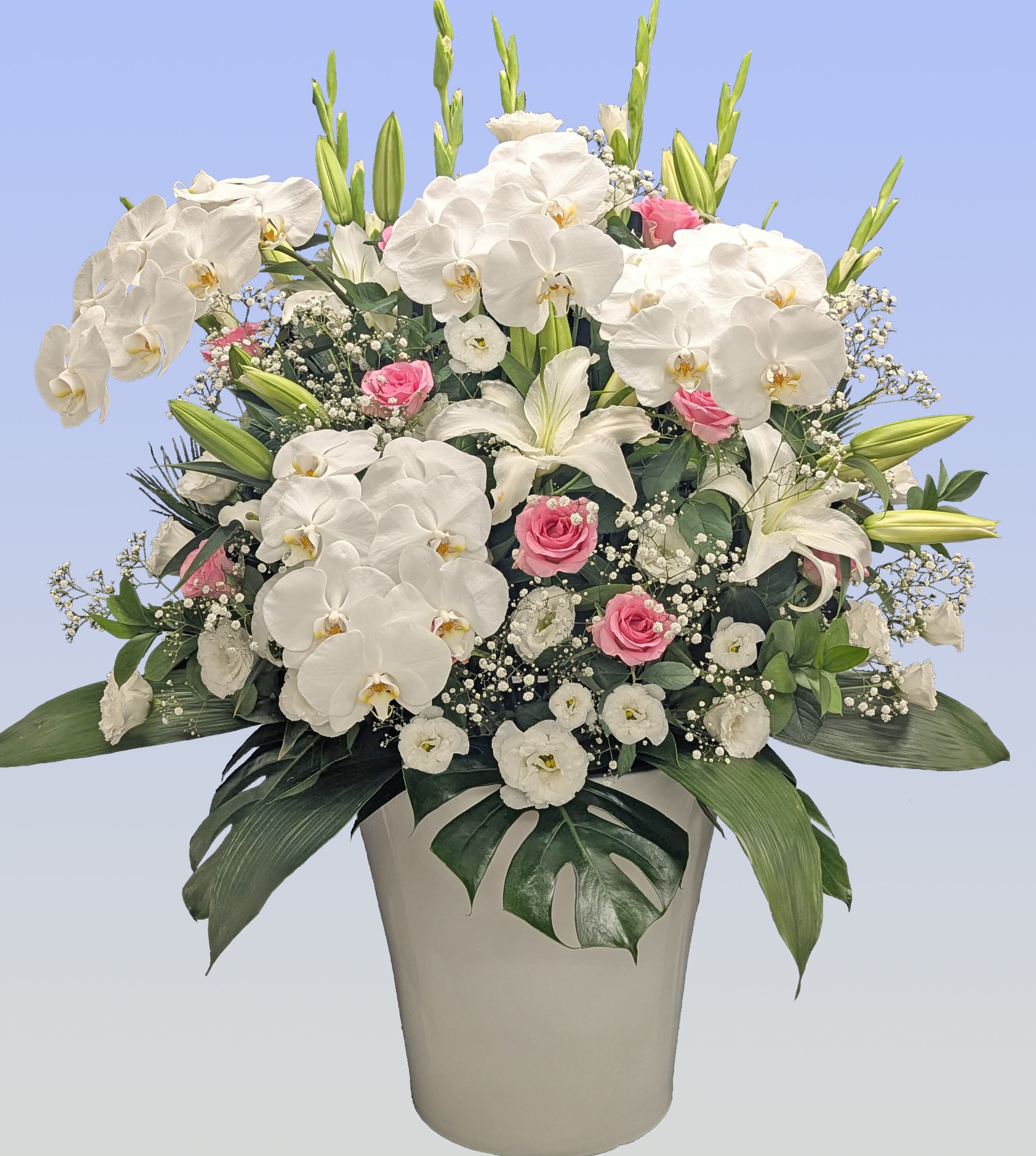 バラ入りの供花は、華麗なバラの花々が美しく調和し、故人を偲ぶ場にふさわしい優雅な雰囲気を演出する特別な供花です。心を込めてお届けするこの作品は、愛と感謝の気持ちを美しく表現できる一品です!
